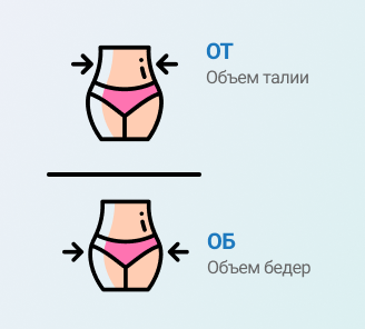 В первую очередь диагностировать ожирение можно по соотношению обхвата талии (ОТ) к объему бедер (ОБ).
